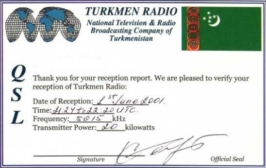 Radio Ashgabad wurde nach dem Zusammenbruch der Turkmenischen SSR im Jahr 1994 neu gegründet und arbeitete mit zwei verbliebenen 20 kW-Sendern auf 4825, 4930 und 5015 khz.